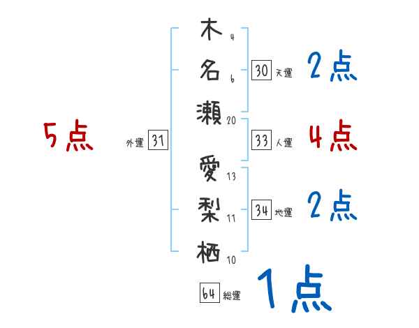 総運![]() | 木名瀬愛梨栖さんの総運は64画の1つ星!災難が多く精神的なもろさに注意。トラブルに巻き込まれないように気をつけて。 あなたの人生を表す1番重要な運勢です。生涯を通じて影響する総合運となり、主に50歳以降の晩年期に影響を及ぼします。 |