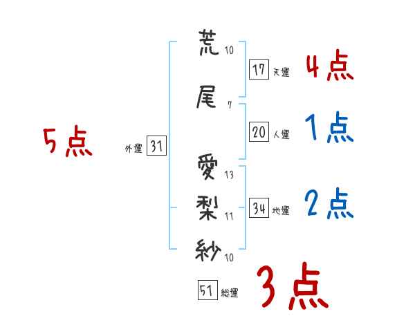 総運![]() | 荒尾愛梨紗さんの総運は51画の3つ星!変化が激しく、危険に注意。堅実な性格。 あなたの人生を表す1番重要な運勢です。生涯を通じて影響する総合運となり、主に50歳以降の晩年期に影響を及ぼします。 |