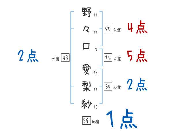 人運![]() | 野々口愛梨紗さんの人運は16画の5つ星!人望が厚く大きく発展する。逆転成功が見える。 性格や才能などを表す2番目に重要な運勢です。人間関係や協調性、社会的な成功に影響します。主に20歳から50歳ぐらいまでの中年期の運勢を表します。 |
