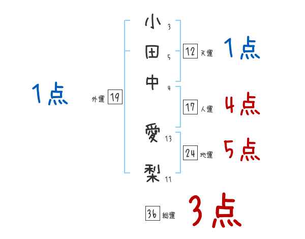 総運![]() | 小田中愛梨さんの総運は36画の3つ星!先見性が豊かです。多少神経質で苦労することも。 あなたの人生を表す1番重要な運勢です。生涯を通じて影響する総合運となり、主に50歳以降の晩年期に影響を及ぼします。 |