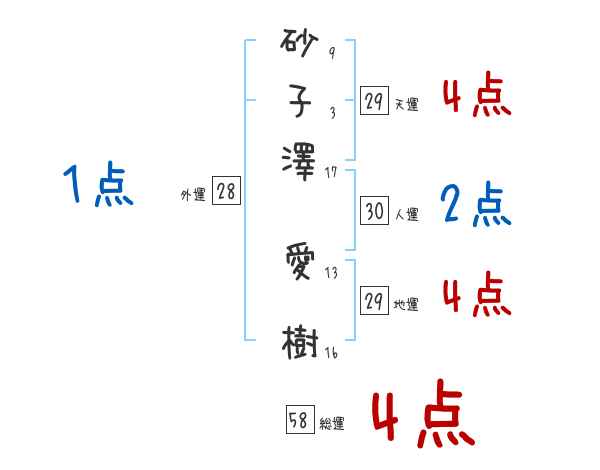 天運![]() | 砂子澤愛樹さんの天運は29画の4つ星!完全主義で才能がある。厳格な心の持ち主。 家系が持つ宿命的な運勢を表します。祖先から受け継いだ苗字ですので自分の力が及びません。家柄を象徴します。 |