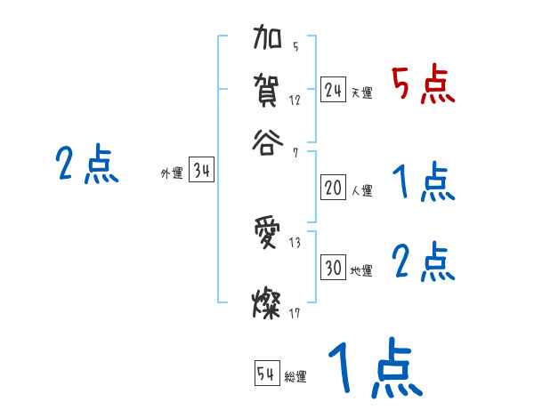 天運![]() | 加賀谷愛燦さんの天運は24画の5つ星!家庭運が良く順調な人生。金運にも恵まれる。 家系が持つ宿命的な運勢を表します。祖先から受け継いだ苗字ですので自分の力が及びません。家柄を象徴します。 |