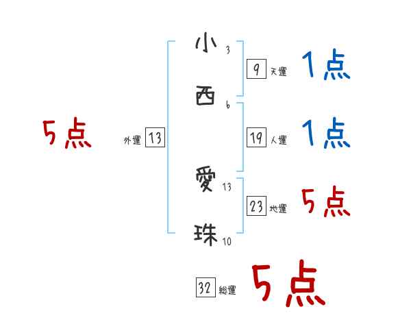 総運![]() | 小西愛珠さんの総運は32画の5つ星!柔軟性があり成功する。チャンスが多く金運が良い。 あなたの人生を表す1番重要な運勢です。生涯を通じて影響する総合運となり、主に50歳以降の晩年期に影響を及ぼします。 |