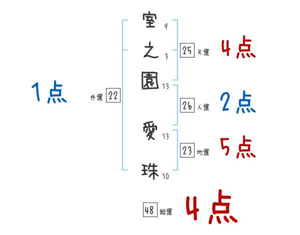 外運![]() | 室之園愛珠さんの外運は22画の1つ星!努力することが苦手ないっぽう手先が器用。芸術性にも優れる。 生活面を象徴する運勢です。外部から受ける影響力を表し、結婚運、家庭運や職場、環境への順応性を表します。 |