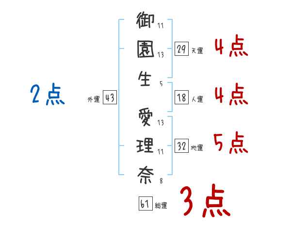 地運![]() | 御園生愛理奈さんの地運は32画の5つ星!柔軟性があり成功する。チャンスが多く金運が良い。 個性を表す基礎的な運勢です。性格形成や対人関係、行動力など家庭環境に影響されます。主に誕生してから20歳くらいまでの若年期の運勢を表します。 |