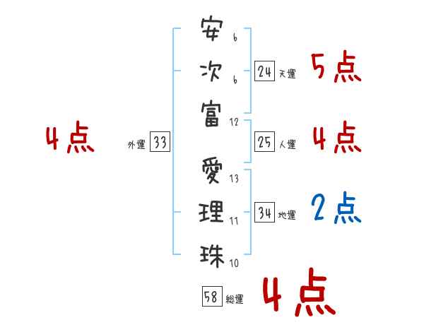 天運![]() | 安次富愛理珠さんの天運は24画の5つ星!家庭運が良く順調な人生。金運にも恵まれる。 家系が持つ宿命的な運勢を表します。祖先から受け継いだ苗字ですので自分の力が及びません。家柄を象徴します。 |