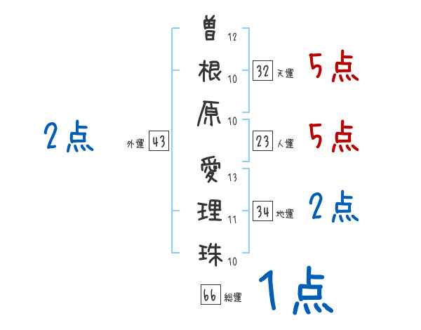 天運![]() | 曽根原愛理珠さんの天運は32画の5つ星!柔軟性があり成功する。チャンスが多く金運が良い。 家系が持つ宿命的な運勢を表します。祖先から受け継いだ苗字ですので自分の力が及びません。家柄を象徴します。 |
