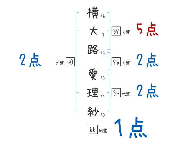 天運![]() | 横大路愛理紗さんの天運は32画の5つ星!柔軟性があり成功する。チャンスが多く金運が良い。 家系が持つ宿命的な運勢を表します。祖先から受け継いだ苗字ですので自分の力が及びません。家柄を象徴します。 |