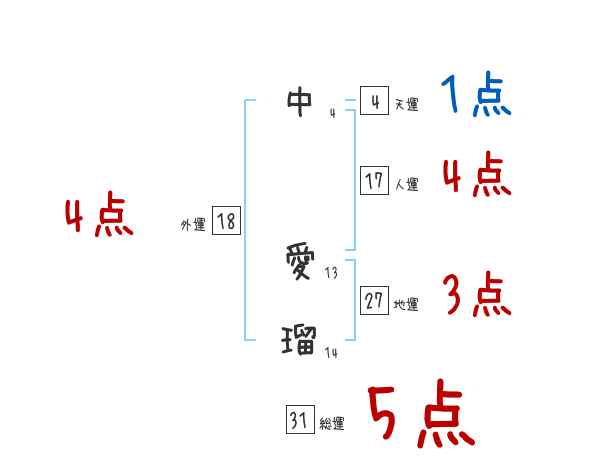 天運![]() | 中愛瑠さんの天運は4画の1つ星!感情が不安定で苦労するかも。周囲との協調を心掛けましょう。 家系が持つ宿命的な運勢を表します。祖先から受け継いだ苗字ですので自分の力が及びません。家柄を象徴します。 |