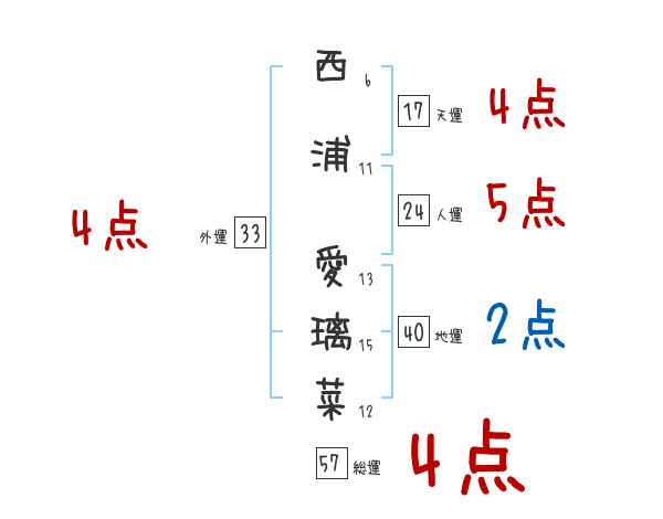 外運![]() | 西浦愛璃菜さんの外運は33画の4つ星!権力志向でプライドが高い。勇気があり運を切り開き成功する。 生活面を象徴する運勢です。外部から受ける影響力を表し、結婚運、家庭運や職場、環境への順応性を表します。 |
