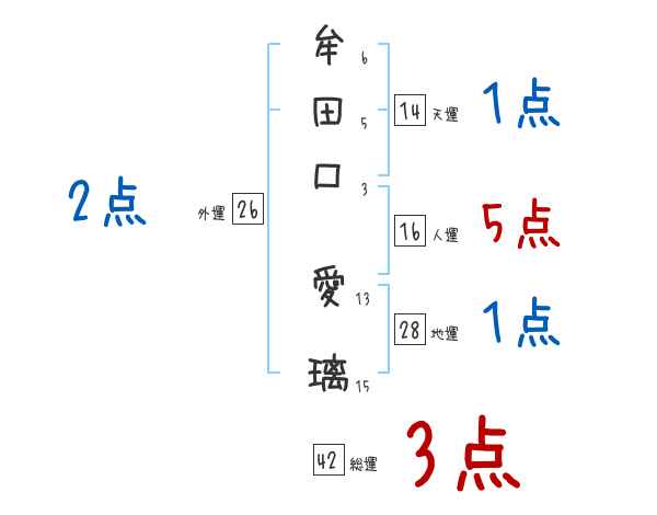 人運![]() | 牟田口愛璃さんの人運は16画の5つ星!人望が厚く大きく発展する。逆転成功が見える。 性格や才能などを表す2番目に重要な運勢です。人間関係や協調性、社会的な成功に影響します。主に20歳から50歳ぐらいまでの中年期の運勢を表します。 |