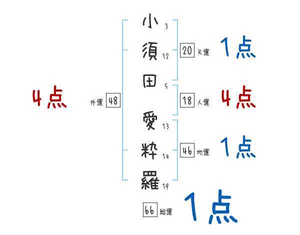 人運![]() | 小須田愛粋羅さんの人運は18画の4つ星!情熱的で剛気。忍耐力があり信頼される。 性格や才能などを表す2番目に重要な運勢です。人間関係や協調性、社会的な成功に影響します。主に20歳から50歳ぐらいまでの中年期の運勢を表します。 |