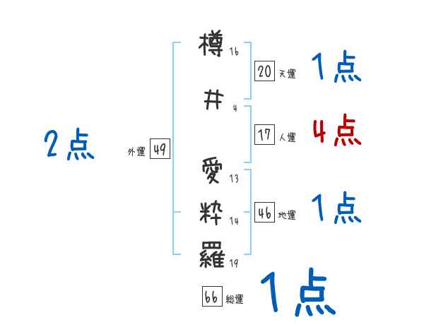 外運![]() | 樽井愛粋羅さんの外運は49画の2つ星!不安定な性格で明暗がある人生。周りの人には支援されやすい。 生活面を象徴する運勢です。外部から受ける影響力を表し、結婚運、家庭運や職場、環境への順応性を表します。 |