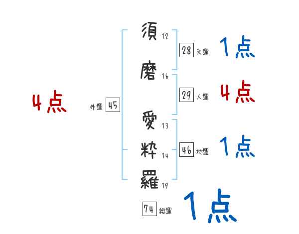 天運![]() | 須磨愛粋羅さんの天運は28画の1つ星!家庭環境に注意。スポーツで活躍できる能力があるかも。 家系が持つ宿命的な運勢を表します。祖先から受け継いだ苗字ですので自分の力が及びません。家柄を象徴します。 |
