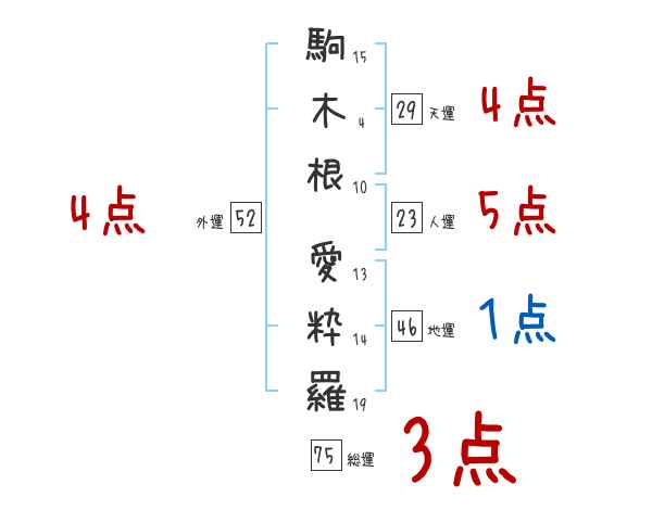 外運![]() | 駒木根愛粋羅さんの外運は52画の4つ星!先見性と独創性に優れ考える力がある。強運の持ち主。 生活面を象徴する運勢です。外部から受ける影響力を表し、結婚運、家庭運や職場、環境への順応性を表します。 |