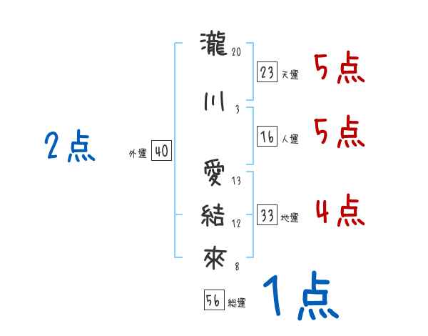 人運![]() | 瀧川愛結來さんの人運は16画の5つ星!人望が厚く大きく発展する。逆転成功が見える。 性格や才能などを表す2番目に重要な運勢です。人間関係や協調性、社会的な成功に影響します。主に20歳から50歳ぐらいまでの中年期の運勢を表します。 |