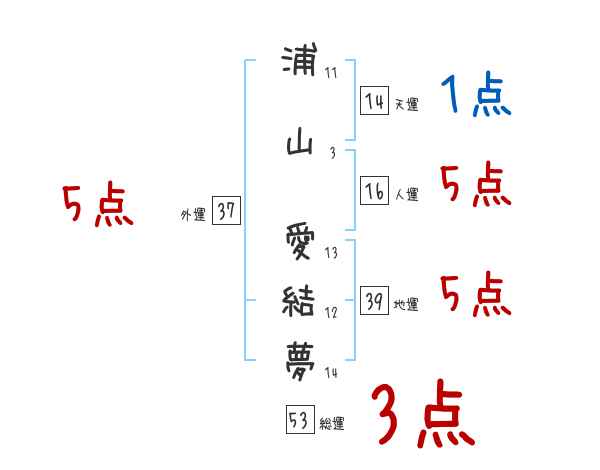 総運![]() | 浦山愛結夢さんの総運は53画の3つ星!やや見栄っ張りで虚栄心がある。散財に注意。 あなたの人生を表す1番重要な運勢です。生涯を通じて影響する総合運となり、主に50歳以降の晩年期に影響を及ぼします。 |
