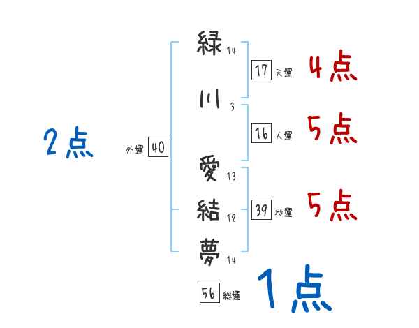 人運![]() | 緑川愛結夢さんの人運は16画の5つ星!人望が厚く大きく発展する。逆転成功が見える。 性格や才能などを表す2番目に重要な運勢です。人間関係や協調性、社会的な成功に影響します。主に20歳から50歳ぐらいまでの中年期の運勢を表します。 |