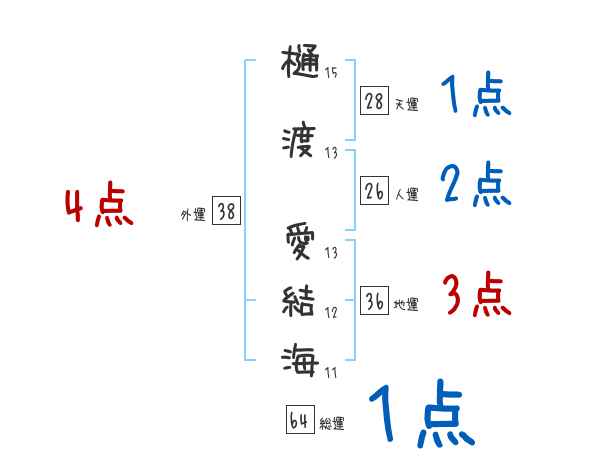 外運![]() | 樋渡愛結海さんの外運は38画の4つ星!温厚な性格で技術的な才能を発揮する。職人的な仕事に向いている。 生活面を象徴する運勢です。外部から受ける影響力を表し、結婚運、家庭運や職場、環境への順応性を表します。 |