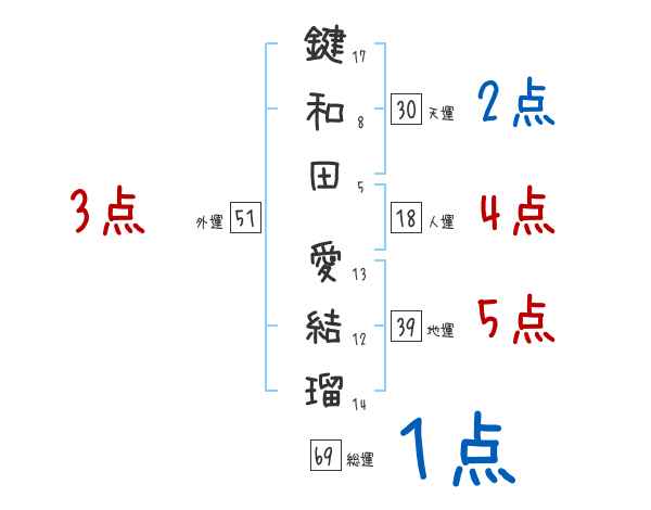 鍵和田愛結瑠さんの総運は69画の1つ星