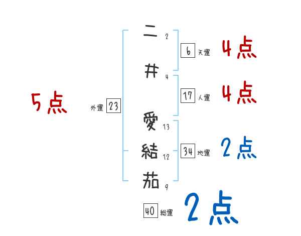 外運![]() | 二井愛結茄さんの外運は23画の5つ星!想像力に優れ活力がある。一代で成功し名誉を手に入れる。 生活面を象徴する運勢です。外部から受ける影響力を表し、結婚運、家庭運や職場、環境への順応性を表します。 |