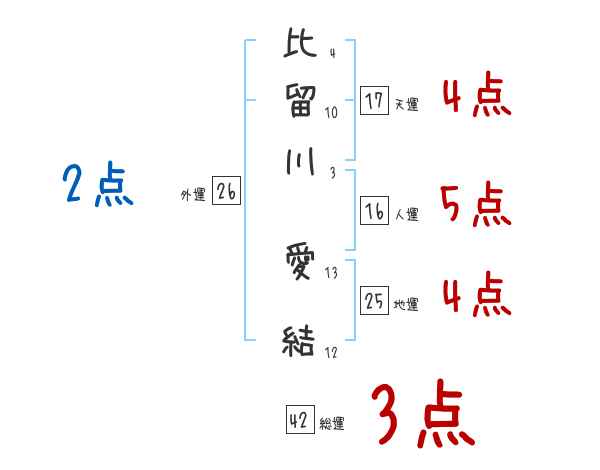 外運![]() | 比留川愛結さんの外運は26画の2つ星!波瀾万丈かも。信頼できる人を大事にしましょう。 生活面を象徴する運勢です。外部から受ける影響力を表し、結婚運、家庭運や職場、環境への順応性を表します。 |