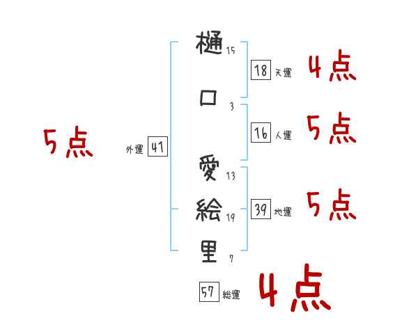 天運![]() | 樋口愛絵里さんの天運は18画の4つ星!情熱的で剛気。忍耐力があり信頼される。 家系が持つ宿命的な運勢を表します。祖先から受け継いだ苗字ですので自分の力が及びません。家柄を象徴します。 |
