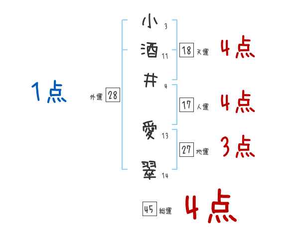 外運![]() | 小酒井愛翠さんの外運は28画の1つ星!家庭環境に注意。スポーツで活躍できる能力があるかも。 生活面を象徴する運勢です。外部から受ける影響力を表し、結婚運、家庭運や職場、環境への順応性を表します。 |
