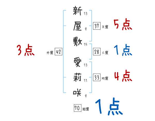 人運![]() | 新屋敷愛莉咲さんの人運は28画の1つ星!家庭環境に注意。スポーツで活躍できる能力があるかも。 性格や才能などを表す2番目に重要な運勢です。人間関係や協調性、社会的な成功に影響します。主に20歳から50歳ぐらいまでの中年期の運勢を表します。 |