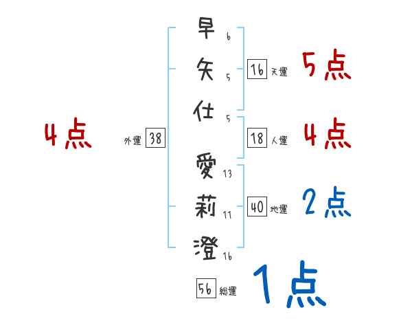 人運![]() | 早矢仕愛莉澄さんの人運は18画の4つ星!情熱的で剛気。忍耐力があり信頼される。 性格や才能などを表す2番目に重要な運勢です。人間関係や協調性、社会的な成功に影響します。主に20歳から50歳ぐらいまでの中年期の運勢を表します。 |