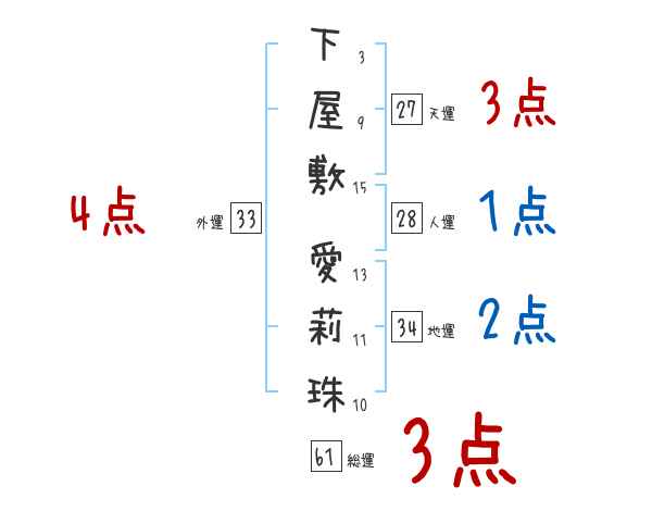 天運![]() | 下屋敷愛莉珠さんの天運は27画の3つ星!頭脳明晰だが強情で摩擦が多い傾向。孤立に注意。 家系が持つ宿命的な運勢を表します。祖先から受け継いだ苗字ですので自分の力が及びません。家柄を象徴します。 |