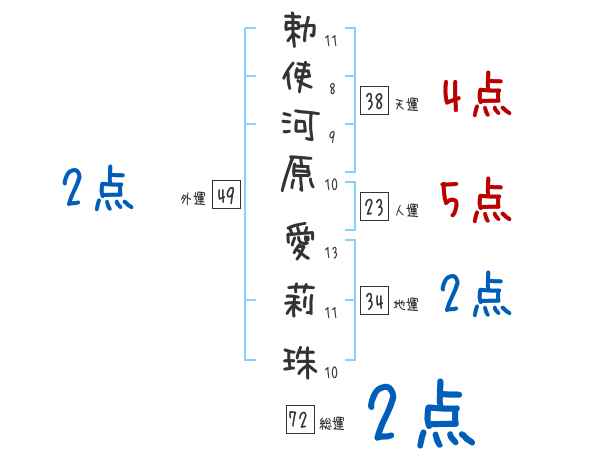 総運![]() | 勅使河原愛莉珠さんの総運は72画の2つ星!災難が多く不安定な生活にならないように注意。明暗のある人生かも。 あなたの人生を表す1番重要な運勢です。生涯を通じて影響する総合運となり、主に50歳以降の晩年期に影響を及ぼします。 |