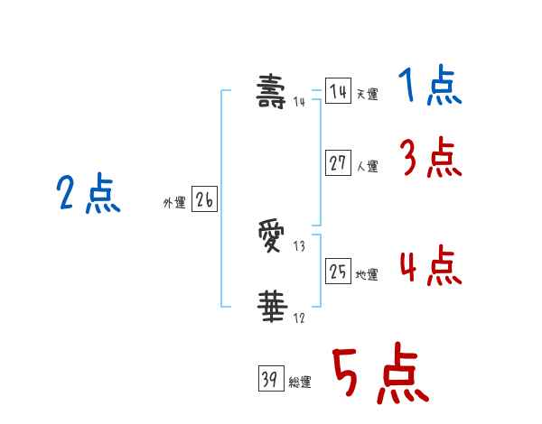 総運![]() | 壽愛華さんの総運は39画の5つ星!社交性に優れ人望が厚い。人の上に立ち成功する。 あなたの人生を表す1番重要な運勢です。生涯を通じて影響する総合運となり、主に50歳以降の晩年期に影響を及ぼします。 |