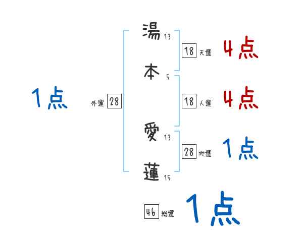 人運![]() | 湯本愛蓮さんの人運は18画の4つ星!情熱的で剛気。忍耐力があり信頼される。 性格や才能などを表す2番目に重要な運勢です。人間関係や協調性、社会的な成功に影響します。主に20歳から50歳ぐらいまでの中年期の運勢を表します。 |