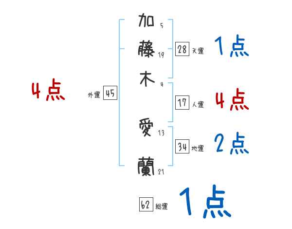 天運![]() | 加藤木愛蘭さんの天運は28画の1つ星!家庭環境に注意。スポーツで活躍できる能力があるかも。 家系が持つ宿命的な運勢を表します。祖先から受け継いだ苗字ですので自分の力が及びません。家柄を象徴します。 |