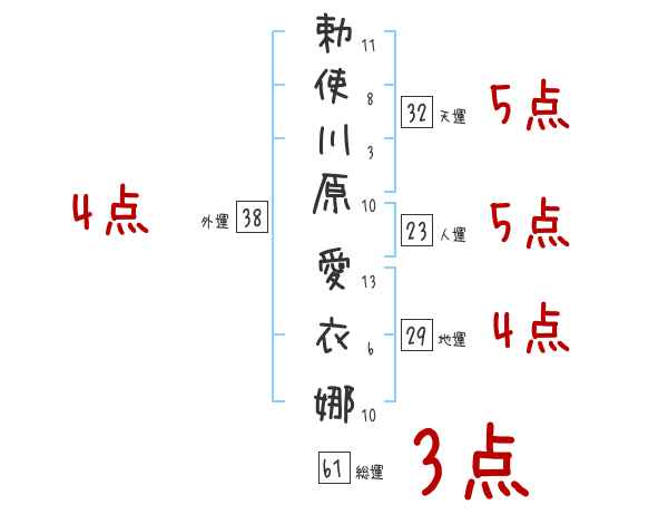 天運![]() | 勅使川原愛衣娜さんの天運は32画の5つ星!柔軟性があり成功する。チャンスが多く金運が良い。 家系が持つ宿命的な運勢を表します。祖先から受け継いだ苗字ですので自分の力が及びません。家柄を象徴します。 |