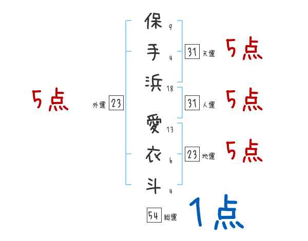 外運![]() | 保手浜愛衣斗さんの外運は23画の5つ星!想像力に優れ活力がある。一代で成功し名誉を手に入れる。 生活面を象徴する運勢です。外部から受ける影響力を表し、結婚運、家庭運や職場、環境への順応性を表します。 |
