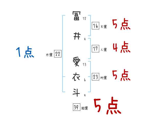 外運![]() | 冨井愛衣斗さんの外運は22画の1つ星!努力することが苦手ないっぽう手先が器用。芸術性にも優れる。 生活面を象徴する運勢です。外部から受ける影響力を表し、結婚運、家庭運や職場、環境への順応性を表します。 |