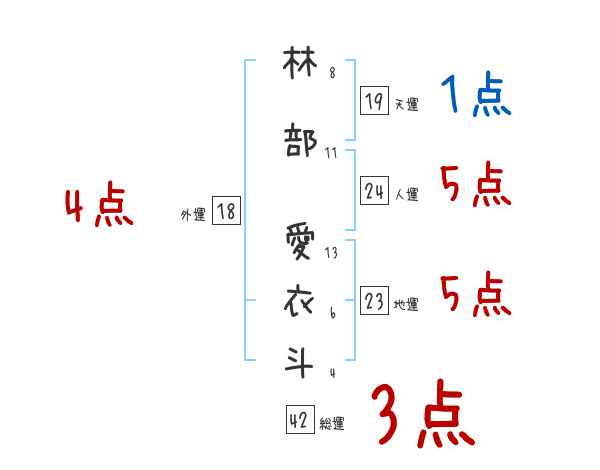 天運![]() | 林部愛衣斗さんの天運は19画の1つ星!優れた才能を持ちますが、協調性が足りないことも。周りの人と協力する事を意識しましょう。 家系が持つ宿命的な運勢を表します。祖先から受け継いだ苗字ですので自分の力が及びません。家柄を象徴します。 |