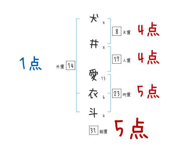 天運![]() | 犬井愛衣斗さんの天運は8画の4つ星!勤勉家。根気強く努力し成功する。忍耐力がある。 家系が持つ宿命的な運勢を表します。祖先から受け継いだ苗字ですので自分の力が及びません。家柄を象徴します。 |