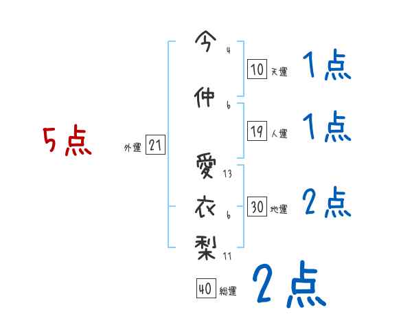 外運![]() | 今仲愛衣梨さんの外運は21画の5つ星!統率力がある。独立し成功する。名誉を手に入れる。 生活面を象徴する運勢です。外部から受ける影響力を表し、結婚運、家庭運や職場、環境への順応性を表します。 |