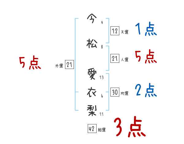 外運![]() | 今松愛衣梨さんの外運は21画の5つ星!統率力がある。独立し成功する。名誉を手に入れる。 生活面を象徴する運勢です。外部から受ける影響力を表し、結婚運、家庭運や職場、環境への順応性を表します。 |