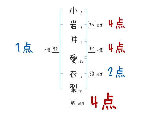 総運![]() | 小岩井愛衣梨さんの総運は45画の4つ星!もくもくと物事を進め達成する。地味な努力家。 あなたの人生を表す1番重要な運勢です。生涯を通じて影響する総合運となり、主に50歳以降の晩年期に影響を及ぼします。 |