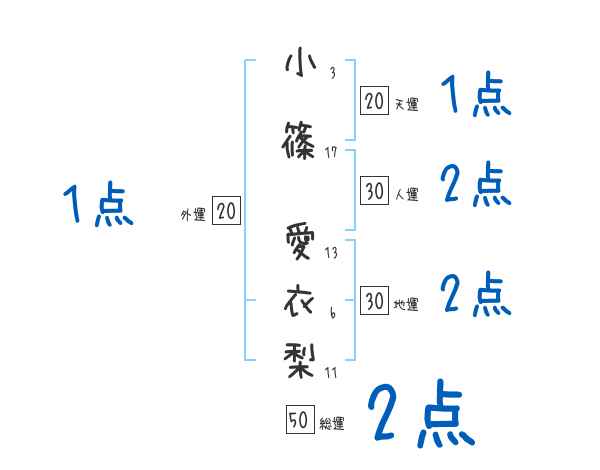 外運![]() | 小篠愛衣梨さんの外運は20画の1つ星!社交が苦手。人とは違った才能があり波乱万丈な人生かも。 生活面を象徴する運勢です。外部から受ける影響力を表し、結婚運、家庭運や職場、環境への順応性を表します。 |
