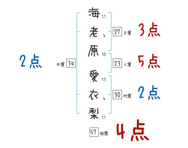 外運![]() | 海老原愛衣梨さんの外運は34画の2つ星!独創性に優れるが、自尊心が強く災難に注意しましょう。 生活面を象徴する運勢です。外部から受ける影響力を表し、結婚運、家庭運や職場、環境への順応性を表します。 |