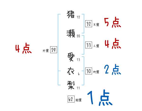 天運![]() | 猪瀬愛衣梨さんの天運は32画の5つ星!柔軟性があり成功する。チャンスが多く金運が良い。 家系が持つ宿命的な運勢を表します。祖先から受け継いだ苗字ですので自分の力が及びません。家柄を象徴します。 |