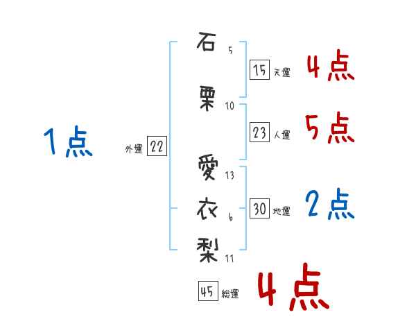 人運![]() | 石栗愛衣梨さんの人運は23画の5つ星!想像力に優れ活力がある。一代で成功し名誉を手に入れる。 性格や才能などを表す2番目に重要な運勢です。人間関係や協調性、社会的な成功に影響します。主に20歳から50歳ぐらいまでの中年期の運勢を表します。 |
