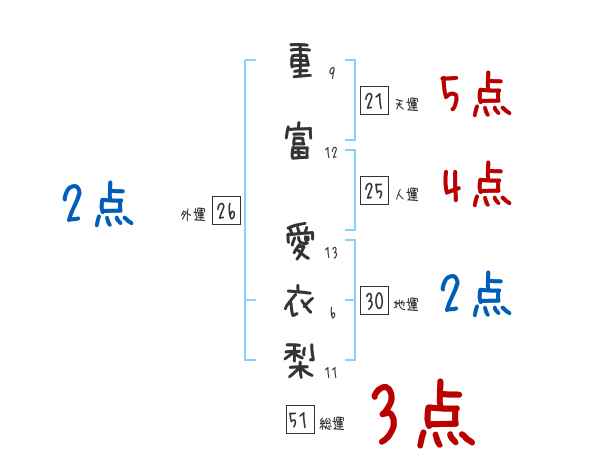 天運![]() | 重富愛衣梨さんの天運は21画の5つ星!統率力がある。独立し成功する。名誉を手に入れる。 家系が持つ宿命的な運勢を表します。祖先から受け継いだ苗字ですので自分の力が及びません。家柄を象徴します。 |
