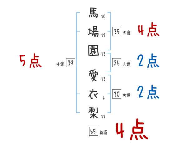外運![]() | 馬場園愛衣梨さんの外運は39画の5つ星!社交性に優れ人望が厚い。人の上に立ち成功する。 生活面を象徴する運勢です。外部から受ける影響力を表し、結婚運、家庭運や職場、環境への順応性を表します。 |