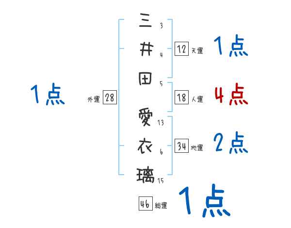 総運![]() | 三井田愛衣璃さんの総運は46画の1つ星!迷走することが多く苦労するかも。目先のことにとらわれないように。 あなたの人生を表す1番重要な運勢です。生涯を通じて影響する総合運となり、主に50歳以降の晩年期に影響を及ぼします。 |